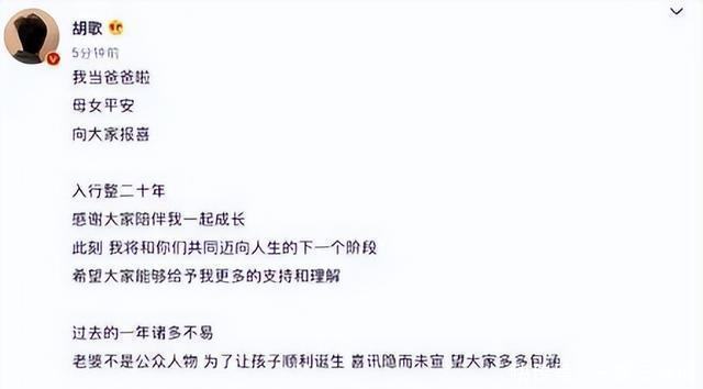 2023年1月31日,胡歌突然在社交平台官宣“我当爸爸了,老婆不是公众人物,为了孩子“小茉莉”顺利出生,喜讯未公布,望大家包含”。