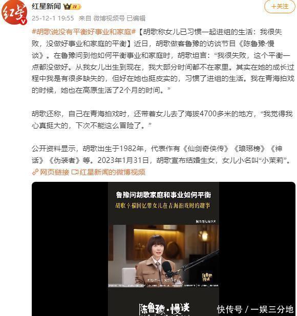 父母爱子则为之计深远 近日,胡歌做客了鲁豫的访谈节目。 在鲁豫问到他如何平衡事业和家庭时,他说“我很失败,这个平衡我一点都没做好”。