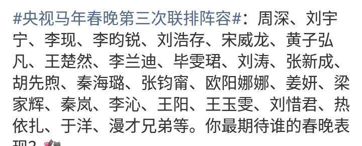 每一个春晚舞台,都是那样精彩动人!歌手周深的春晚梦,在2026年的新年令人非常期待!歌手周深的代表作品,深受观众喜爱!《万里晴空》、《河》、《十年之约》、《天海一心》、《奔腾》、《好风起》、《光亮》,广为流传!歌手周深在2025年举行个人演唱会,优美动听的歌声,从内地到香港,真正走进观众的心中!此刻的周深,厚积薄发,歌手实力很强!歌手刘宇宁参与马年央视春晚第三次联排,带来了一个好结果。早在央视春晚第一次和第二次联排的时候,歌手刘宇宁就积极参与其中!央视春晚第三次联排的邀请,证明歌手刘宇宁究竟有多优秀!引人关注的是,知名歌手周传雄现身央视春晚第三次联排现场!回首歌手周传雄的音乐作品,曾经温暖了很多人的心灵!从《黄昏》到《寂寞沙洲冷》,再到《青花》,周传雄的音乐作品温暖人心,治愈心灵!值得一提的是,歌手周传雄参与此次央视春晚联排演出,可谓是意义重大!因为早在2024年,歌手周传雄就参加了江苏卫视春晚舞台演出!歌手周传雄的春晚舞台,在马年,令人期待不已!所以,在2026年央视春晚联排进行到第三次的时候,一个尤为重要的结果出现了!那就是在接下来的春晚联排演出中,谁才是最后的胜出者?谁的作品,才会得到央视春晚评委们的青睐!