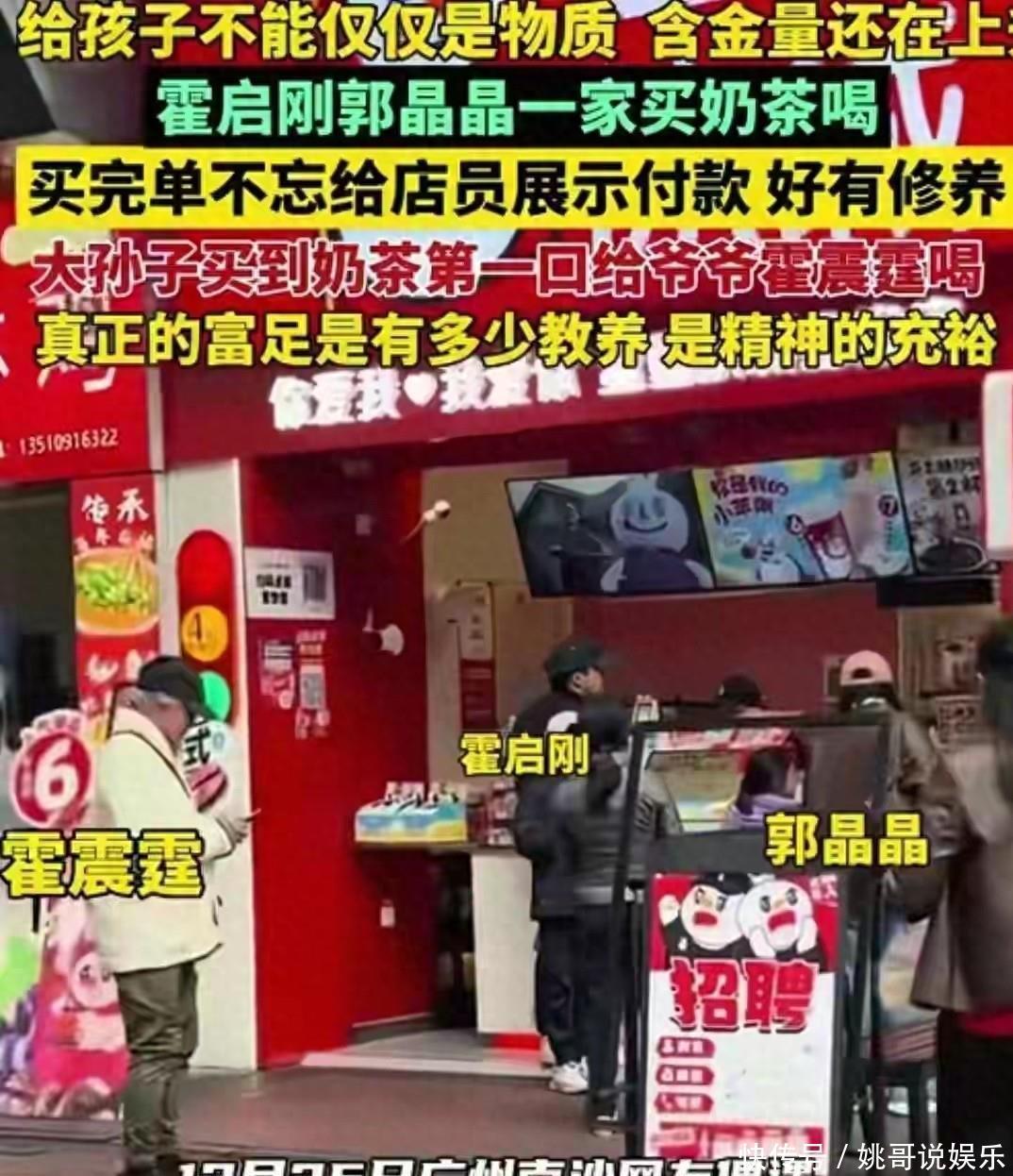 广州南沙一家蜜雪冰城门口,郭晶晶和霍启刚带着三个孩子,还岁的霍震霆老爷子,一家六口排着队买奶茶。没有保镖,也没助理,霍启刚自己扫码付钱,郭晶晶穿件普通羽绒服在旁边等,就像哪家亲戚周末出来闲逛。